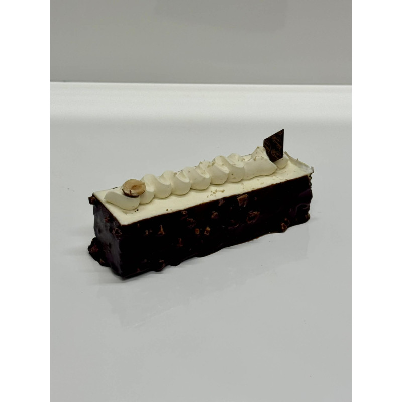 Dacquoise aux Noisettes, Croustillant au Chocolat au Lait, Crémeux Chocolat Caraïbse 66%, Mousse Chocolat Noir Guanaja 70%.